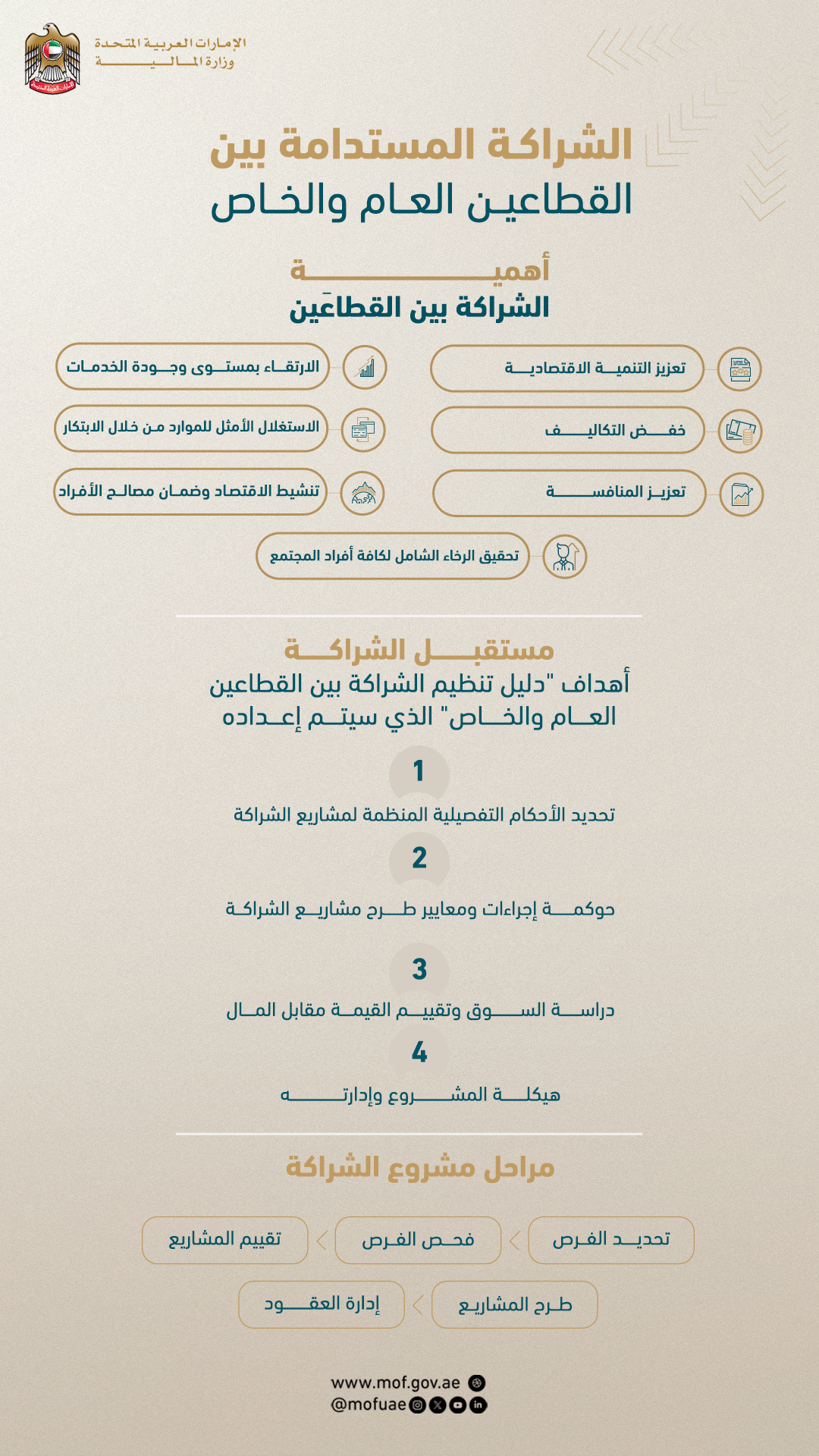 تولي وزارة المالية اهتماما كبيرا لتعزيز الشراكة بين القطاعين العام والخاص في دولة الإمارات العربية المتحدة، إذ تدرك أهمية هذه الشراكة في تطوير الاقتصاد والمجتمع وضمان الرخاء للمواطنين. وقد أظهرت التجارب العالمية أن الشراكة تزيد من فعالية الأداء وتحسن جودة الخدمات وتقلل التكاليف وتستغل بشكل أفضل الموارد من خلال التنافسية والابتكار.
