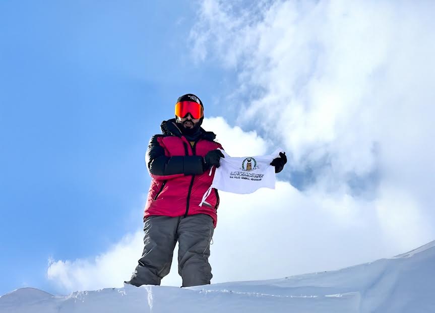 ضابط في شرطة رأس الخيمة يرفع علم الدولة وشعار القيادة على أعلى قمة في أوروبا