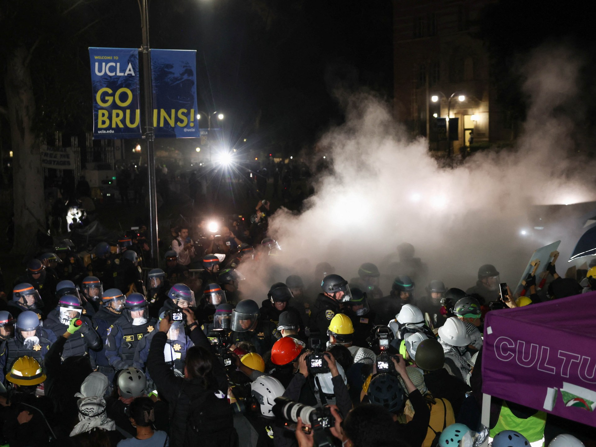 اقتحمت الشرطة الأميركية حرم جامعة كاليفورنيا وأطلقت قنابل دخان على الطلاب المعتصمين الذين يطالبون بوقف الحرب على قطاع غزة، مما أدى إلى اعتقال عدد منهم ووقوع اشتباكات بين الطلاب وقوات الأمن. وتجمع مئات من أفراد الشرطة في حرم الجامعة باللوس أنجلوس استعدادًا لإزالة مخيم الاعتصام في إطار تصاعد التوتر في الجامعات الأمريكية نتيجة للاحتجاجات على جرائم إسرائيل في قطاع غزة.