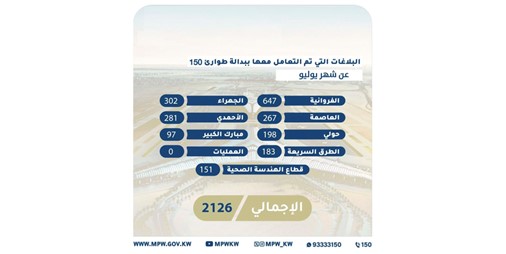 «الأشغال» تعاملت مع أكثر من 2126 بلاغاً خلال يوليو