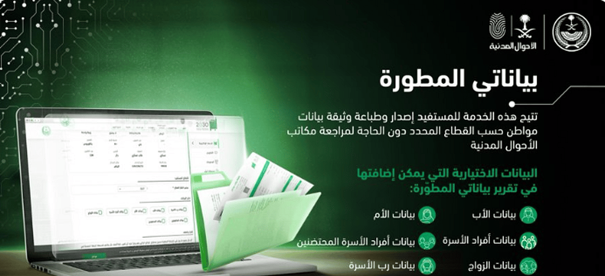 Summarize this content to 2000 words in 6 paragraphs in Arabic تم النشر في: 30 أبريل 2025, 7:55 مساءًأوضحت وكالة وزارة الداخلية للأحوال المدنية، اليوم الأربعاء، المزايا التي تتيحها خدمة «بياناتي المطورة».وأضافت الوكالة، عبر حسابها بمنصة (إكس)، أن الخدمة تتيح للمستفيد إصدار وطباعة وثيقة بيانات المواطن حسب القطاع المحدد من دون حاجة لمراجعة مكاتب الأحوال المدنية.وأكملت، أن البينات الاختيارية التي يمكن إضافتها في تقرير بياناتي المطورة تشمل، بيانات الأب، والأم، وبيانات أفراد الأسرة، وبيانات أفراد الأسرة المحتضنين، وبيانات الزواج، ورب الأسرة، وبينانات العمالة.عبر خدمة بياناتي المطورة..يمكنك إصدار وطباعة وثيقة بيانات مواطن بكل سهولة من خلال موقع منصة #أبشر.#أسهل_أسرع pic.twitter.com/INmlwTY80I— أبشر (@Absher) April 30, 2025