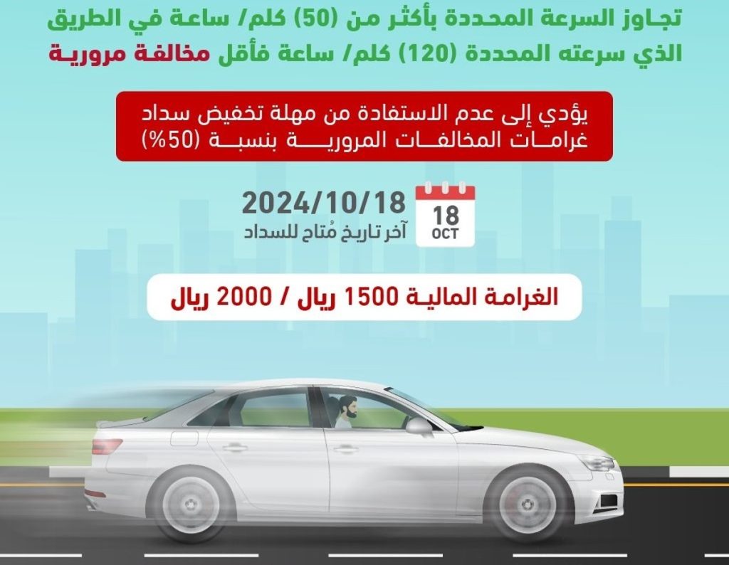 Summarize this content to 2000 words in 6 paragraphs in Arabic أوضحت الإدارة العامة للمرور، اليوم الأربعاء، أن «تجاوز حد السرعة الأقصى يمنع الاستفادة من مهلة سداد الغرامات».وتابعت الإدارة، أن «القيادة بسرعة تتجاوز الحد الأقصى بـ (50) كلم/ ساعة في الطريق الذي سرعته المحددة (120) كلم/ ساعة فأقل، يؤدي إلى عدم الاستفادة من مهلة سداد غرامات تخفيض المخالفات المرورية بنسبة 50 %».وكانت الإدارة أكدت في وقت سابق، وأضاف «المرور»، أنه فى حالة فعل المواطن ذلك، يعرض نفسه للغرامة، وعدم الاستفادة من مهلة سداد غرامات تخفيض المخالفات المرورية بنسبة 50 %.”القيادة بسرعة تتجاوز الحد الأقصى بـ (50) كلم/ ساعة في الطريق الذي سرعته المحددة (120) كلم/ ساعة فأقل”، يؤدي إلى عدم الاستفادة من مهلة سداد غرامات #تخفيض_المخالفات_المرورية بنسبة (50%).#المرور_السعودي pic.twitter.com/rUZ5fw16p8— المرور السعودي (@eMoroor) May 29, 2024