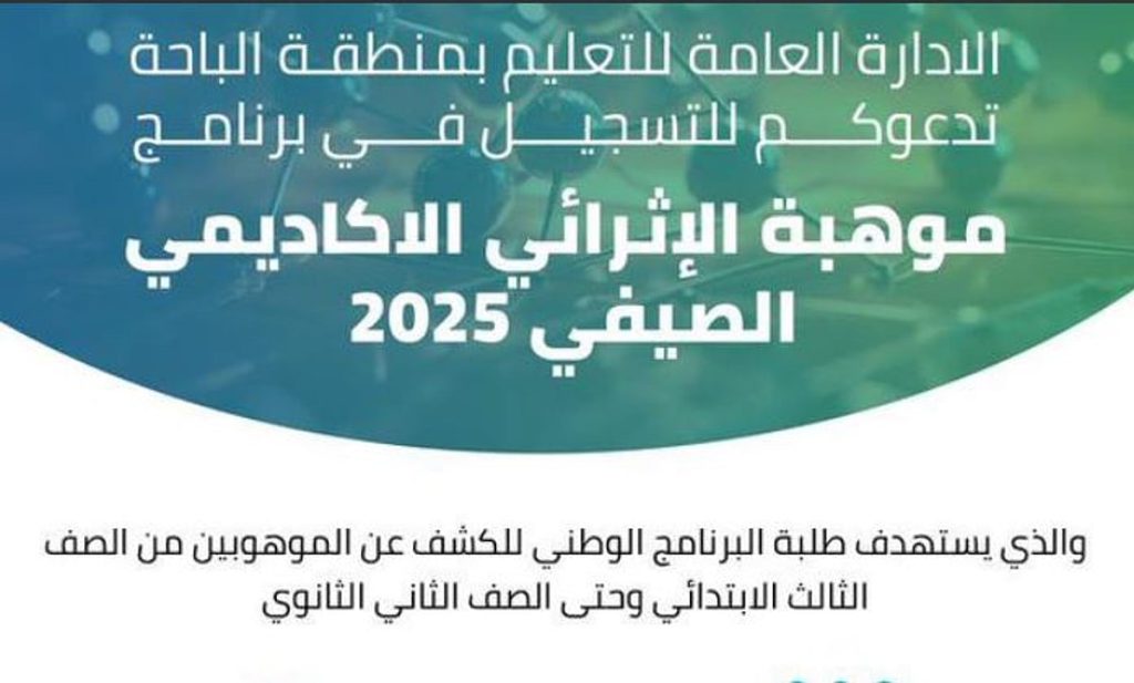 Summarize this content to 2000 words in 6 paragraphs in Arabic أعلنت الإدارة العامة للتعليم بمنطقة الباحة، بدء التسجيل في برنامج “موهبة” الإثرائي الأكاديمي الصيفي لعام 2025، الذي سيُقام خلال الفترة من 4 إلى 22 محرم 1447هـ، عبر الرابط: https://www.mawhiba.org.وأوضحت الإدارة أن البرنامج سيُنفذ في ثانوية الملك سعود بمدينة الباحة، ويستهدف طلاب الصف الثالث الابتدائي حتى الصف الثاني الثانوي، ويشمل مسارات علمية هي: “كن عالِمًا” في الأحياء والعلوم الطبية، والاختراعات، والنمذجة ثلاثية الأبعاد، والروبوتات، والفيزياء النظرية والتطبيقية.ويُعدّ برنامج “موهبة” الإثرائي الصيفي أداة لإثراء المعرفة، ورفع الكفاءة، وبناء الخبرات العلمية والعملية وفق منهجيات عالمية، إذ يتضمن أنشطة تركز على تطوير المهارات الشخصية للطلاب، وتأهيلهم للمشاركة الفاعلة والمتميزة في البرامج الأخرى التي ترعاها “موهبة” داخل المملكة وخارجها.دعوة | #تعليم_الباحة يدعو للتسجيل في برنامج ” موهبة الإثرائي الأكاديمي الصيفي” لعام 2025، الذي يستهدف طلبة البرنامج الوطني للكشف عن الموهوبين من الصف الثالث الابتدائي وحتى الصف الثاني ثانوي. pic.twitter.com/zfU6fUkBAW— إدارة تعليم الباحة (@MOE_BHH) April 22, 2025