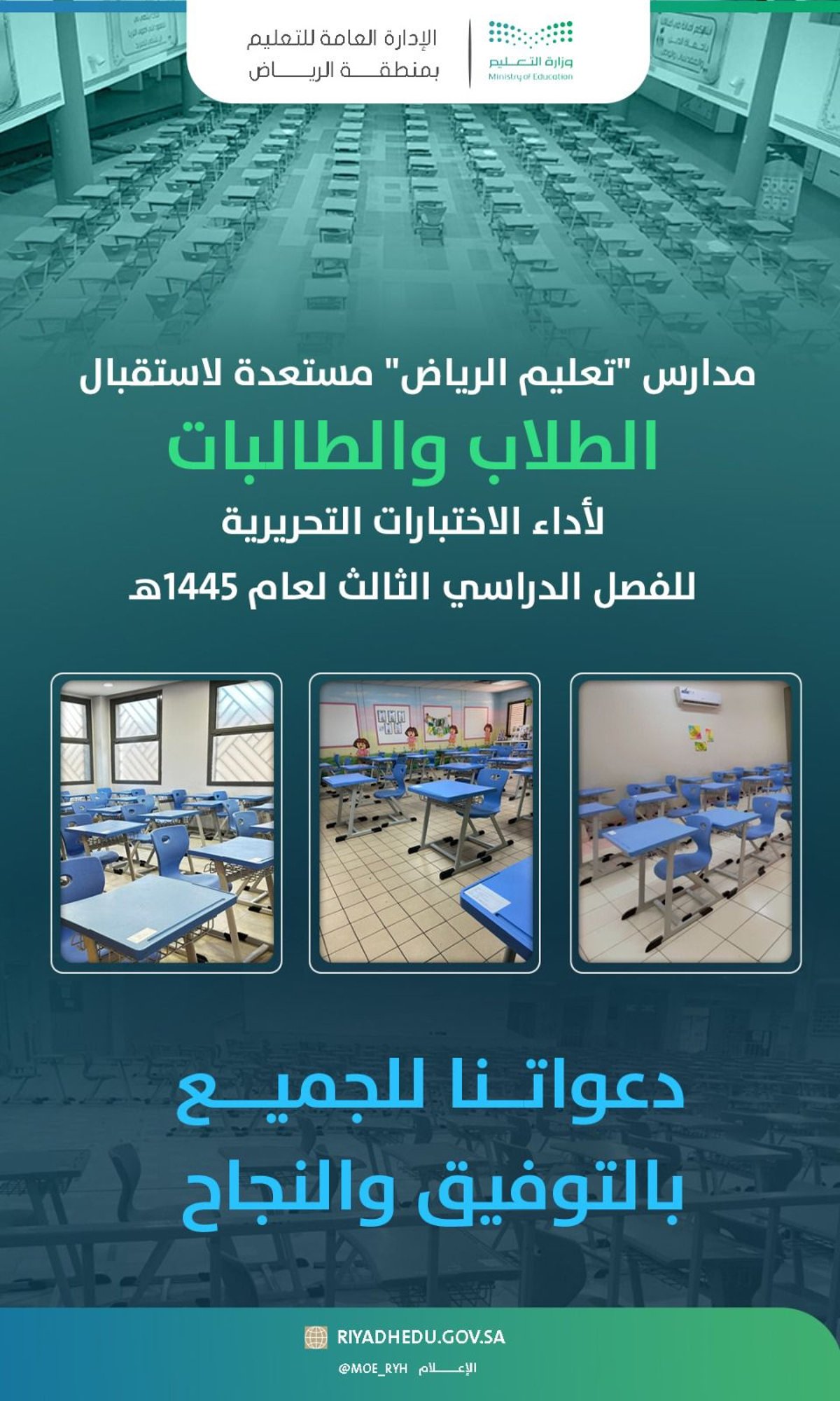 Summarize this content to 2000 words in 6 paragraphs in Arabic تنطلق بمدارس الإدارة العامة للتعليم بمنطقة الرياض يوم غدٍ الثلاثاء الاختبارات التحريرية للفصل الدراسي الثالث للعام الدراسي ١٤٤٥هـ . وأوضح المتحدث الرسمي لتعليم الرياض الأستاذ عبدالسلام الثميري أن الإدارة أنهت كافة الاستعدادات لتأدية الطلاب والطالبات من الصف الثالث ابتدائي وحتى الثالث ثانوي اختبارات نهاية الفصل الدراسي الثالث مشيراً إلى أن بداية الاختبارات لجميع المراحل ستكون الساعة الـ7 صباحاً فيما تبدأ اختبارات طلاب وطالبات التعليم المستمر الساعة الـ4 مساءً. وأفاد الثميري أن الإدارة خصصت هواتف إرشادية لتهيئة الطلبة لاختبارات الفصل الدراسي الثالث وتقديم الاستشارات الخاصة بالاختبارات وحددت الإدارة عمل الهاتف الإرشادي خلال الفترة من الاثنين 26 ذو القعدة وحتى الأحد 3 ذو الحجة من الساعة 8 صباحاً وحتى 12 ظهراً عبر الهواتف التالية: بنين 0507097040 – 0553060196 – بنات 0114093298وأشار إلى أن تعليمات الاختبارات نصت على إنهاء عمليات الرصد والتدقيق وإعلان نتائج الطلاب والطالبات في نظام نور قبل نهاية دوام يوم الاثنين 4 ذو الحجة القادم . وبيّن الثميري أن الإدارة أعدت خطة إعلامية قبل وأثناء وبعد الاختبارات تتضمن العديد من التوجيهات والتعليمات والنصائح للطلاب والطالبات وأولياء الأمور من خلال المنصات الإعلامية المعتمدة ووسائل التواصل الاجتماعي متمنياً التوفيق والنجاح لجميع الطلاب والطالبات.