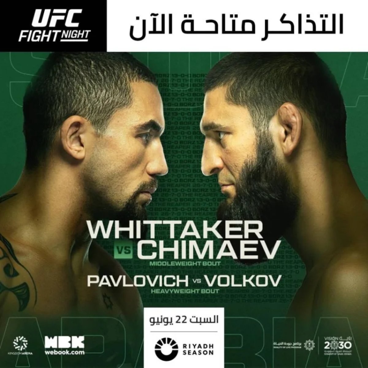 سيتم عقد نزال في فنون القتال المختلطة بين الأسترالي روبرت ويتكر والإماراتي حمزة شيماييف في الرياض بتاريخ 22 يونيو المقبل، وستكون هذه المباراة جزء من أول حدث لمنظمة UFC في المملكة العربية السعودية. ويمكن للجمهور شراء تذاكر الحدث من خلال منصة webook عبر الرابط المتاح.