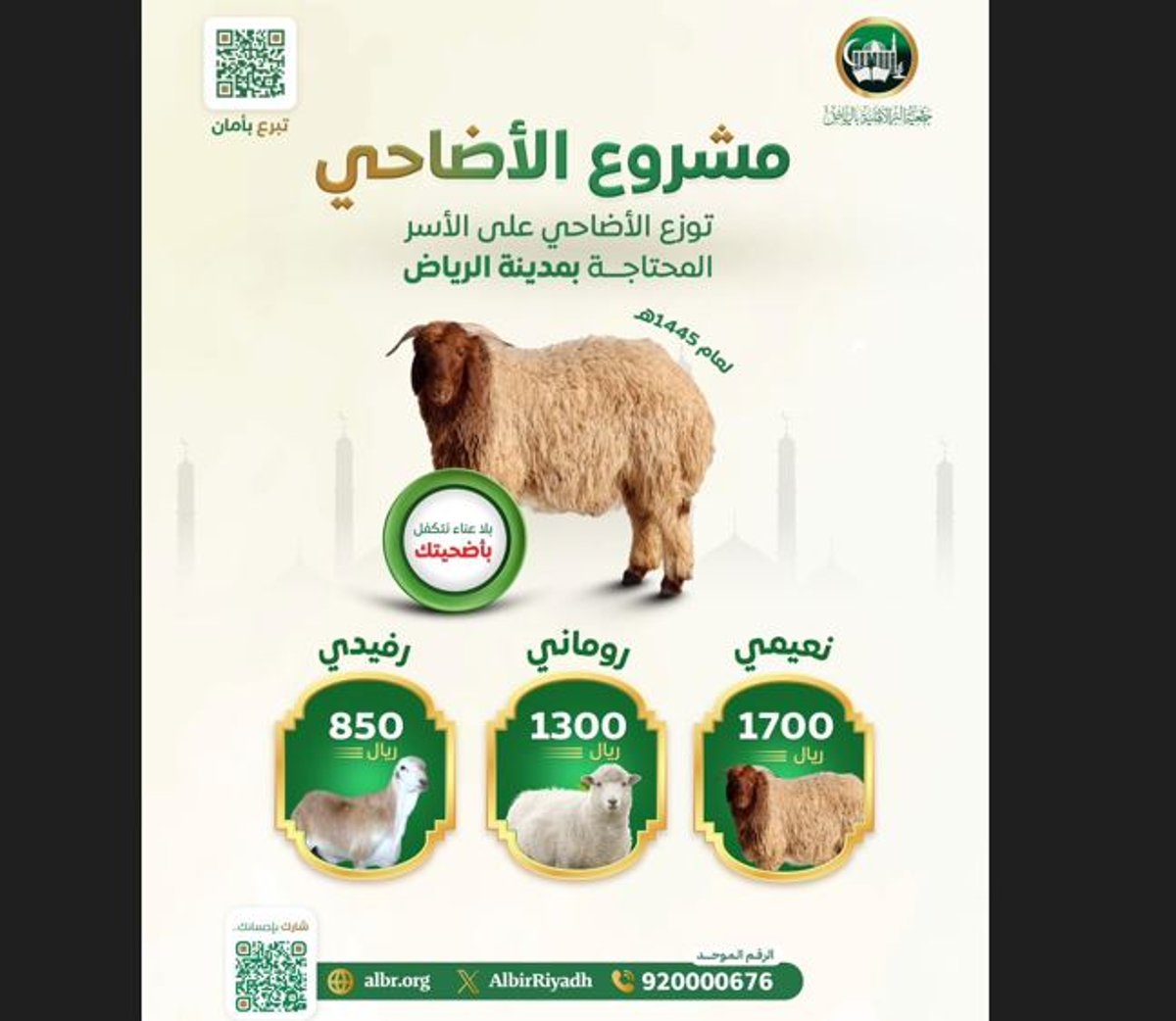 Summarize this content to 2000 words in 6 paragraphs in Arabic أطلقت جمعية البر بالرياض، اليوم، مشروع الأضاحي، الذي تنفذه سنويًا من خلال توفير الأضحية، بما يتوافق مع الأحكام الشرعية والجودة الصحية، تحت “شعار نتكفل بأضحيتك ونصنع بها فرحتهم في يوم العيد”. ويساعد المشروع في التيسير على المضحي وتأديته هذه الشعيرة مع الحرص على السعر المناسب للاضحية.وتنفذ الجمعية مشروع الأضاحي مع اتباعها الخطوات والطرق الصحيحة في وصولها للمستفيد، بعد عملية الذبح والتجهيز، وكذلك توزيعها عبر سيارات مجهزة ومعدة لهذا الغرض من تبريد وسعة المخزون والانتشار في التوزيع، على حسب أحياء مدينة الرياض؛ لتحافظ على جودتها وسرعة الإنجاز، بما يتناسب مع وقت خروج الأضحية. ويتيح المشروع خيارات عدة في الأضحية من حيث القيمة والنوع والوزن؛ حيث تصنف قيمة الأضحية من النعيمي بمبلغ 1700 ريال، ووزنها 20 كيلو، والأضحية الروماني 1300 ريال، ووزنها 20 كيلو، والأضحية الرفيدي 850 ريالًا، وتزن 16 كيلو، مع إمكانية التواصل للطلب على الرقم الموحد 920000676 أو عبر المتجر الإلكتروني للجمعية https://store.albr.sa/Association/Projects?category=827&a=AD أو حساباتها في منصات التواصل الاجتماعي.