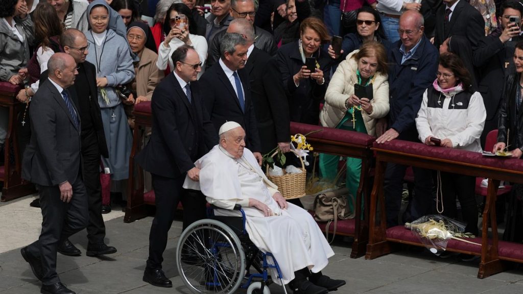 Summarize this content to 2000 words in 6 paragraphs in Arabic ADVERTISEMENTPope Francis continues to surprise the faithful. After his unscheduled visit to Santa Maria Maggiore on Saturday, the pontiff crossed St. Peter’s Square in the Vatican on Sunday morning in his wheelchair at the end of the Palm Sunday Mass.Amid applause and prayers, the pontiff greeted and blessed the faithful. He stopped a few times to greet nuns and children, giving them sweets. After completing the tour of the square, the pope went back up to his rooms in Santa Marta.”When we see the multitude of men and women who hate and violence throw on the way to Calvary, let us remember that God transforms this way into a place of redemption, because he walked it by giving his life for us. How many Cyrenians carry the cross of Christ! Do we recognise them? Do we see the Lord in their faces, torn by war and misery? In the face of the atrocious injustice of evil, carrying the cross of Christ is never in vain, indeed, it is the most concrete way of sharing his saving love,” the Pope wrote in his homily for the Palm Sunday Mass read by Cardinal Leonardo Sandri in a square packed with the faithful.”The passion of Jesus becomes compassion when we reach out our hand to those who can no longer bear it, when we lift up those who have fallen, when we embrace those who are discouraged. Brothers, sisters, in order to experience this great miracle of mercy, let us choose during Holy Week how to carry the cross: not around our necks, but in our hearts,” he continued. “Not only our own, but also that of those who suffer next to us; perhaps of that unknown person whom chance – but is it really chance? – has brought us together. Let us prepare for the Lord’s Easter by becoming cyrenees for one another.”Recovering between surprise visitsPope Francis is still recovering after 38 days at the Agostino Gemelli polyclinic in Rome for double pneumonia. He continues to go about his business, although without holding public religious ceremonies, and has appeared in public several times in the past week. On Thursday he made a surprise visit to St. Peter’s and on Saturday to the basilica of Santa Maria Maggiore.On Wednesday he had already met the British royals Charles III and Camilla, in an unscheduled meeting. Last Sunday he returned to St. Peter’s Square for the first time to greet the faithful at the mass for the Jubilee of the sick and healthcare workers.
