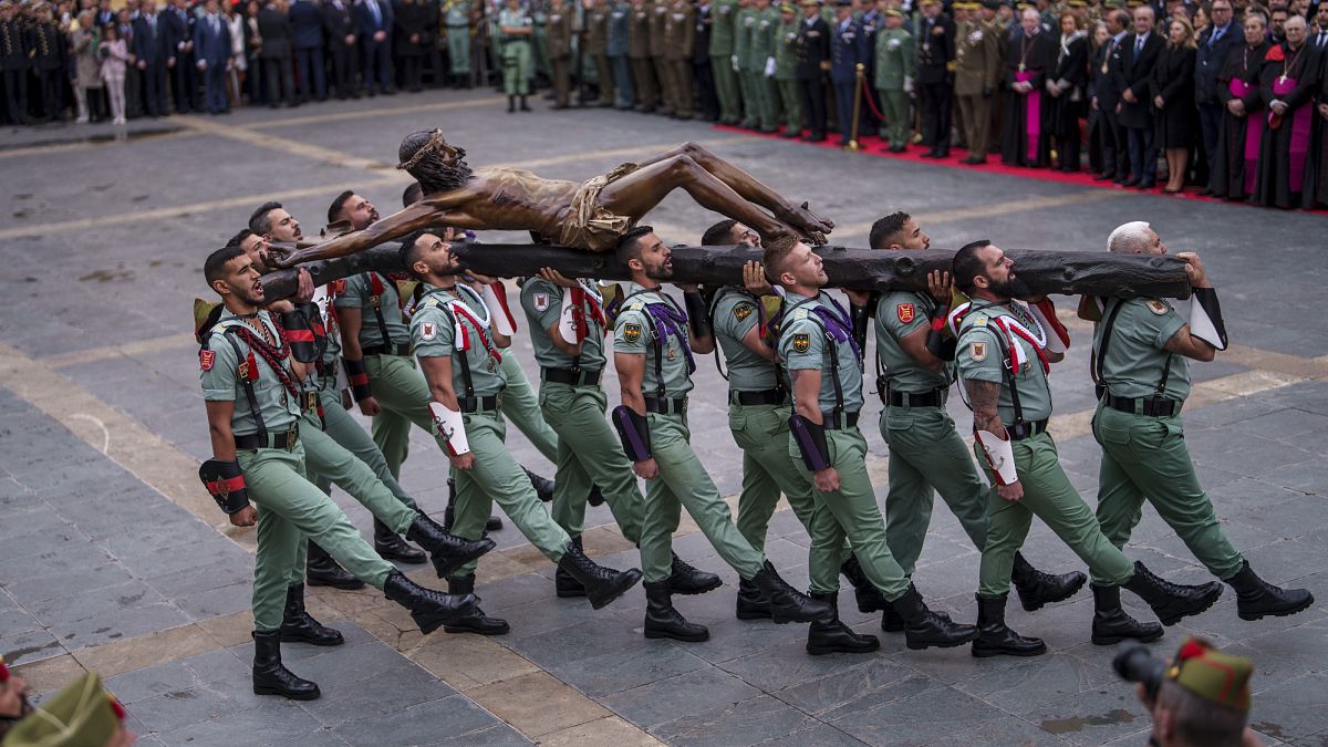 rewrite this title in Arabic Video. Soldiers carry Christ statue in Maundy Thursday parade through Málaga