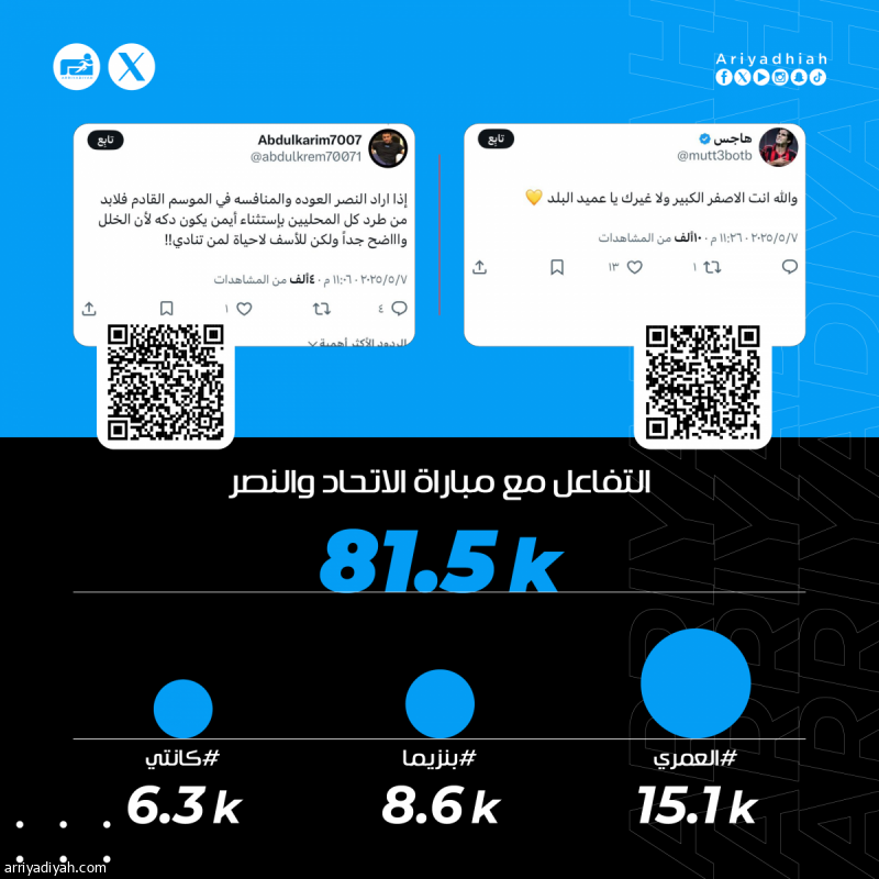 ملأت احتفالات الجماهير الاتحادية بعد فوز فريقها الأول على النصر بنتيجة 3ـ2، ضمن منافسات دوري روشن السعودي، منصة التدوينات القصيرة «إكس». وبلغ التفاعل مع الوسم الخاص بالمباراة في المنصة ذاتها أكثر من 81.5 ألف منشور خلال دقائق من النهاية. وأعرب هاجس عن سعادته بانتصار النادي المُلقب بالعميد وتعزيز صدارته قائلًا: «والله أنت الأصفر الكبير ولا غيرك يا عميد البلد»، ليتفاعل معه متعب كاتبًا :«عظمة على عظمة يا إتي».وأكد محمد على أن الاتحاد في هذه المباراة أثبت للجماهير الرياضية بأنه كبير الأندية السعودية، وذلك بعدما قرأ اللقاء وعاد بعد التأخر بهدفين ثم انتصر، وكتب :«الاتحاد كبير جدة وعميد الأندية السعودية ألف مبروك.. هذه المباراة خير برهان وإثبات على قوة الاتحاد»، ليتجاوب معه فهد بـ:«روح الاتحاد لا تموت». وأشار أيمن إلى أن مباراة الفيحاء المقبلة لابد من أن يسجل خلالها جمهور النادي حضورًا قويًا، وكتب :«أولًا ألف مبروك الفوز الصعب بفضل الله وحده..ثانيًا، حصل ما حصل وانتهت المباراة بخيرها بالفوز وهذا الأهم، وبشرها بالغيابات المصاحبة لها.. ثالثًا، مباراة الفيحاء مباراة جمهور الاتحاد.. مباراة الفيحاء مباراة جمهور الاتحاد.. مباراة الفيحاء مباراة جمهور الاتحاد». ولدى جماهير النصر، قال كيّ :«نهاية الكلام وبدون أي رحمة. بوشل، لاجامي، سلطان الغنام، الحسن، الحقوي، مران، الخيبري، قشيش، آل فتيل، غريب، لابورت. كلهم برا النادي من غير مجاملات. وجيب لنا ناس صاحية تلعب بروح وبمسؤولية أكثر. الموسم القادم لا رحمة لمن يستهين بهذا الشعار». وأشار الكاسبر إلى ضرورة بناء خط هجومي نصراوي قوي كاتبًا :«إذا أردت البطولات عليك أن يكون عندك هجوم !تذكر إذا كنت لا تستطيع أن تسجل فتأكد أنك ستلقم أهدافًا وهذا الشيء طبيعي في كرة القدم، كم من فرصة ضاعت في الشوط الأول! ماذا لو سجلت؟ كان بالإمكان حسمت المباراة بـ 5 أهداف.. نصيحة نصيحة نصيحة اصنع عمودًا فقريًا قويًا للفريق، غير كذا بيكون موسمك سيئ بهذه العناصر، نعم مشكلتك مدرب ولكن عناصرك سيئة».وحمّل عبد الكريم سبب سوء نتائج النصر للاعبين المحليين، قائلًا :«إذا أراد النصر العودة والمنافسة في الموسم القادم فلابد من طرد كل المحليين باستثناء أيمن يكون دكة لأن الخلل واضح جدًا ولكن للأسف لا حياة لمن تنادي!!». وعن لقطة البرتغالي كريستيانو رونالدو، قائد الفريق النصراوي لزملائه بعد الهدف الاتحادي الثاني كتب خالد :«وأنتَ أوَّل النائمين».