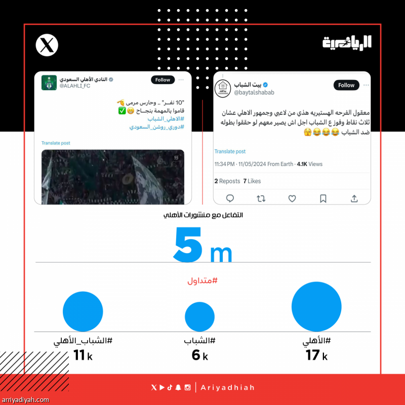 شهدت منصات التواصل الاجتماعي تفاعلًا قياسيًا خلال الساعات الماضية مع مواجهة فريق الشباب الأول لكرة القدم ضد الأهلي في الدوري السعودي، حيث بلغ عدد التفاعلات أكثر من 5 ملايين. تصدرت حسابات النادي الأهلي التفاعل بعد انتصاره في المباراة 2-1، ونشرت تغريدات وفيديوهات تحتفي بالانتصار، جذبت اهتمام الجماهير وأثارت الجدل.