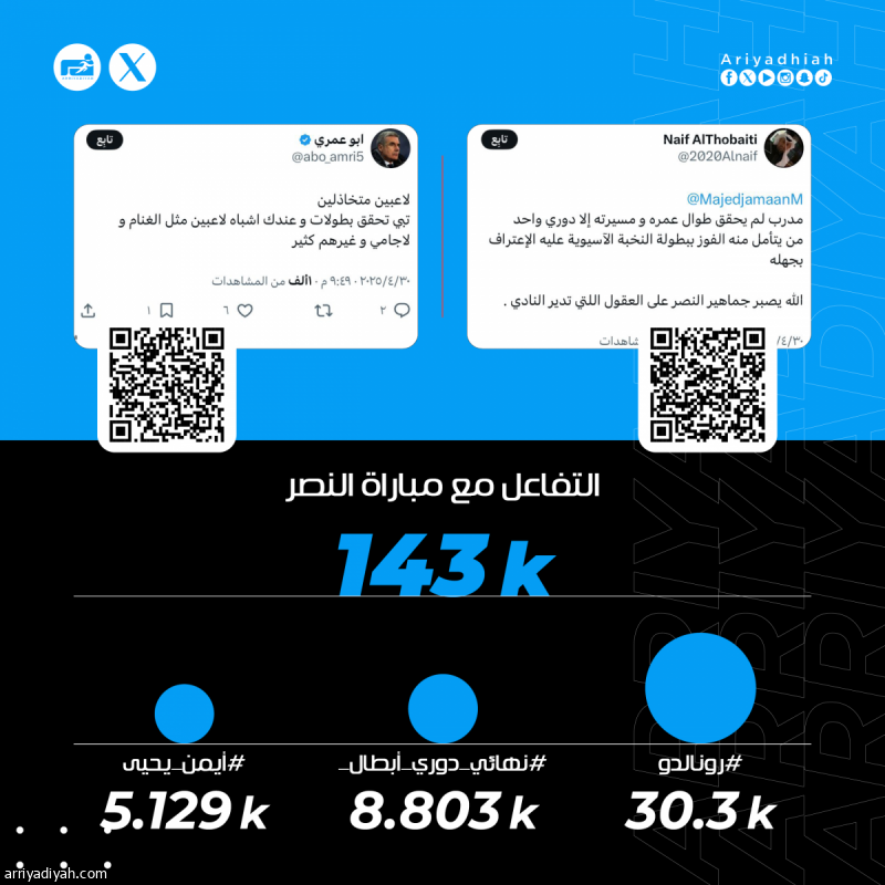 سيطرت حسرة الجماهير النصراوية بعد خسارة فريقها الأول لكرة القدم من كاواساكي الياباني بنتيجة 2ـ3، في مباراة نصف نهائي دوري أبطال آسيا للنخبة، على منصة التدوينات القصيرة «إكس». ووصل التفاعل على الوسم الخاص بالمباراة في المنصة ذاتها إلى 143 ألف منشور، خلال دقائق بعد نهاية اللقاء. وحمّل نايف الإيطالي ستيفانو بيولي، مدرب الفريق، سبب الخسارة، وقال: «مدرب لم يحقق طوال عمره ومسيرته إلا دوري واحد.. من يتأمل منه الفوز ببطولة النخبة الآسيوية عليه الاعتراف بجهله.. الله يصبر جماهير النصر على العقول اللي تدير النادي»، ليوافقه الرأي خالد كاتبًا: «يتحملها بيولي ما احترم الفريق الياباني ولعب بمهاجمين في مباراة نصف نهائي، واستهان بالنادي الياباني وفرغ الوسط، كان المفروض يلعب بأيمن يحيى في الوسط من بدري»، ومثلهم سعد الذي قال: «مدرب فاشل ومتخبط لا يعرف حتى الآن اختيار التشكيلة المناسبة للفريق! وادارة ليس لها وجود سواء فاز الفريق أو خسر، ليس لها تصريح أو تعليق أو ردة فعل وكأنها ليس لها علاقة أو اهتمام بالفريق! شيء عجيب ما يحدث للنصر!!».وأوضح أبو عمري أن اللاعبين أيضًا يتحملون الهزيمة لا المدرب وحده وكتب: «لاعبين متخاذلين.. تبي تحقق بطولات و عندك اشباه لاعبين مثل الغنام و لاجامي و غيرهم كثير». وأكد دخيّل على أن الحظ السيئ هو من وقف في وجه النصر، وقال: «هارد لكم ياعشاق العالمي.. حظ سيئ + مدرب جبان.. النصر لعب آخر ربع ساعة فقط.. العوض بالأهلي يوم السبت إن شاء الله بطولة أهلاوية». وأشار محمد إلى أن الجماهير النصراوية اعتادت على مثل هذه السيناريوهات في وداع البطولات، وكتب: «وداع بأسوأ السيناريوهات.. هذا النصر من عرفناه وهذا حظه.. أفضل اللاعبين عندنا بل حتى أسطورة كرة القدم الدون مثل هذا الفريق المنحوس ومع ذلك بقي النصر مثل ماعهدناه.. الحظ علّة النصر».وعن لقطة الأسطورة البرتغالية كريستيانو رونالدو، قائد الفريق النصراوي، بعد نهاية المباراة والتي ظهر فيها يتحدث مع نفسه قال تركي: «كل شيء سواه، والله يستاهل أنه يتأهل ويرفع الكأس ولكن هذا النصر»، ليتجاوب معه عبد الرحمن بـ: «النصر خلاه يهرج نفسه.. هبلوا فيه».