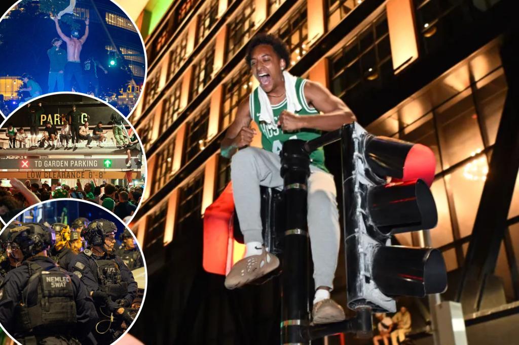 Photos showed fans burning a Mavericks jersey, climbing trees, street light pools and a sign out side TD Garden as police patrolled in riot gear.