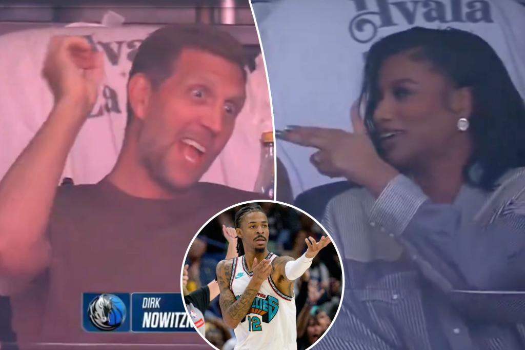 As Rooks took her phone out to take a selfie, Nowitzki broke out Morant’s latest celebration gaffe, the hand grenade.