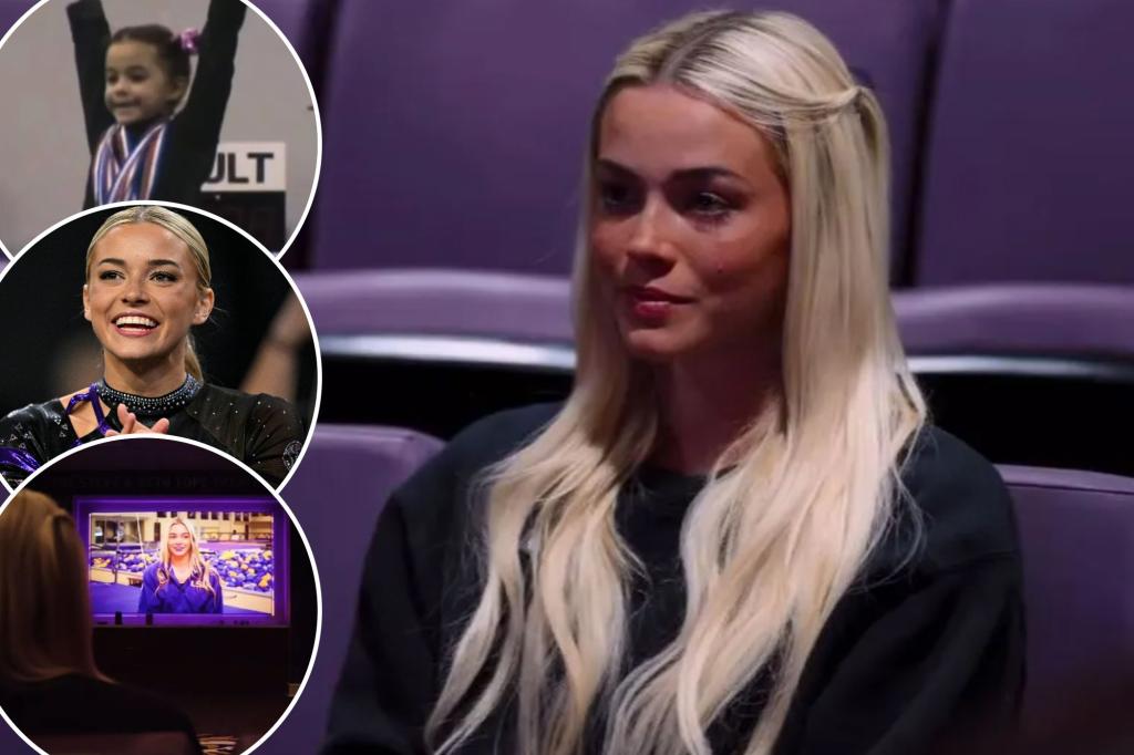 Livvy Dunne couldn’t hold back the tears while watching a video tribute to her gymnastics career as she finally says goodbye to the sport after 20 years.
