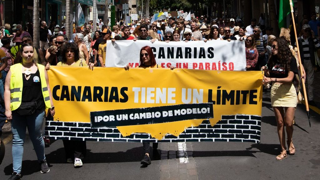 rewrite this title in Arabic Canary Islands plan new protests amid soaring visitor numbers