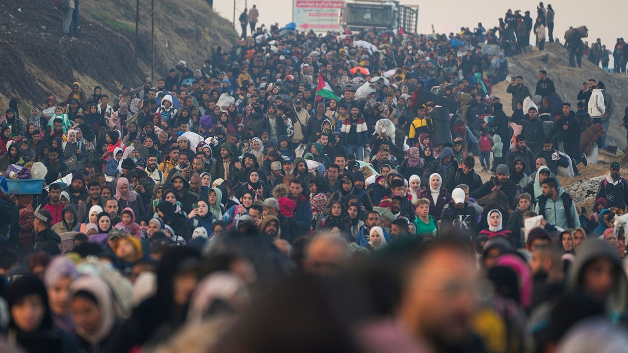 Summarize this content to 2000 words in 6 paragraphs Thousands of Palestinians are streaming back into the northern Gaza Strip on Monday after Israel lifted its closure as part of the ceasefire and hostage release deal with Hamas. Starting at 7 a.m. local time, Palestinians were allowed to cross on foot without inspection via a coastal road passing through part of a military zone bisecting the territory just south of Gaza City that Israel carved out early in the war. A checkpoint for vehicles opened later on Gaza’s main north-south highway, where traffic was backed up for around two miles. “The transfer of militants or weapons via these routes to the northern Gaza Strip will be considered a breach of the agreement. Do not cooperate with any terrorist entity that may try to exploit you to transfer weapons or prohibited materials,” Israel’s military warned in a statement, according to Reuters. Hamas is calling the return “a victory for our people, and a declaration of failure and defeat for the (Israeli) occupation and transfer plans,” according to The Associated Press. ISRAEL, HAMAS REACH DEAL TO ALLOW PALESTINIANS TO RETURN TO NORTHERN GAZA Yasmin Abu Amshah, a mother of three, told the AP that she walked about four miles to reach her damaged but still habitable home in Gaza City, where she also saw her younger sister for the first time in more than a year. “It was a long trip, but a happy one,” she said. “The most important thing is that we returned.” Around a million people fled to southern Gaza in October 2023, while hundreds of thousands remained in the north, which had some of the heaviest fighting and the worst destruction of the war. In all, around 90% of Gaza’s 2.3 million people have been displaced, the news agency says. Israel had delayed the opening of the crossing, which was supposed to happen over the weekend, saying it would not allow Palestinians north until a female civilian hostage, Arbel Yehoud, was released. Israel said she should have been released before four young female soldiers, who were freed on Saturday. ISRAELI VICTIMS OF TERROR CONCERNED WITH MURDERERS’ RELEASE FROM PRISON, RELIEVED 7 HOSTAGES BACK HOME Hamas in turn accused Israel of violating the agreement by not opening the crossing. The gulf nation of Qatar, a key mediator with Hamas, then announced early Monday that an agreement had been reached to release Yehoud along with two other hostages. Hamas also handed over a list of information about the hostages to be released in the ceasefire’s six-week first phase. Under that phase, Hamas is to free a total of 33 hostages in exchange for the release of nearly 2,000 Palestinians imprisoned by Israel. So far under the truce, the terrorist organization has released seven hostages in exchange for more than 300 prisoners. Shiri Bibas and her children Ariel and Kfir were expected to be released over the weekend, but that did not happen. Shiri’s husband, Yarden Bibas, is also among the hostages.The Associated Press contributed to this report.